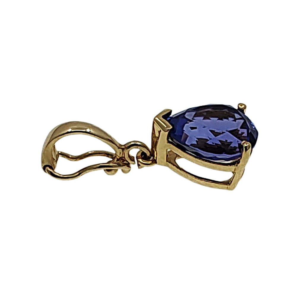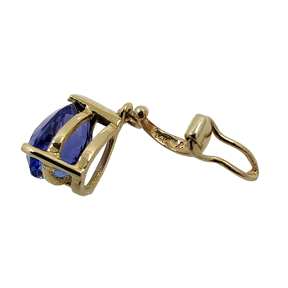 Estate 3 carat pear tanzanite enhancer pendant. This beautiful tanzanite pendant has a 3 carat pear tanzanite with a deep color measuring 9mm x 7.5mm. It is set in a 14 karat yellow gold enhancer pendant. The tanzanite pendant enhancer can be worn on any chain or strand of pearls, making it the perfect, versatile jewelry accent. The pendant weighs 2.5 grams and is 24mm H. A little more about Tanzanite: Tanzanite is only found in one place on Earth! It is mined in the hills of northern Tanzania in the shadows of Mount Kilimanjaro. Tanzanite is a newer gemstone, only being discovered in 1967. It is pleochroic, showing three different colors in three different directions. The most valuable colors are pure blue, similar to sapphire, or a vivid violet-blue. Tanzanite is one of the birthstones for December and the gem for your 24th anniversary.